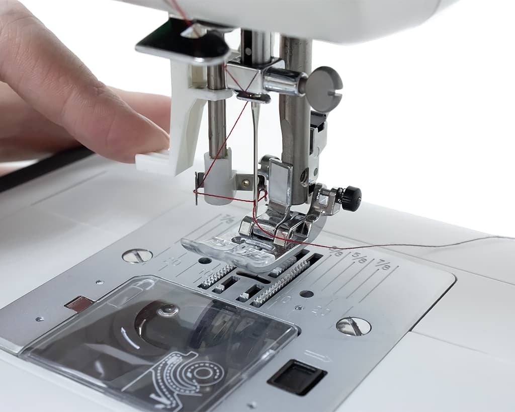 Встроенный заправщик нити облегчит вам трудоемкий процесс. Просто возьмитесь за кончик нити, а нитевдеватель сам протянет ее через ушко иглы.