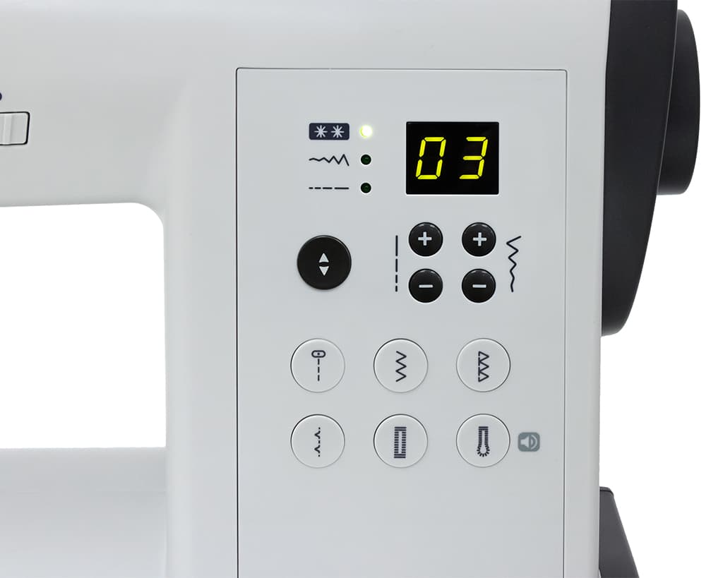 Электронное управление позволяет с помощью нескольких нажатий на клавиши быстро установить номер выбранной строчки, при желании изменить ее ширину и длину стежка, которые устанавливаются автоматически для каждой строчки. Также на панели вы найдете ряд кнопок для быстрого перехода к наиболее востребованным швейным операциям.