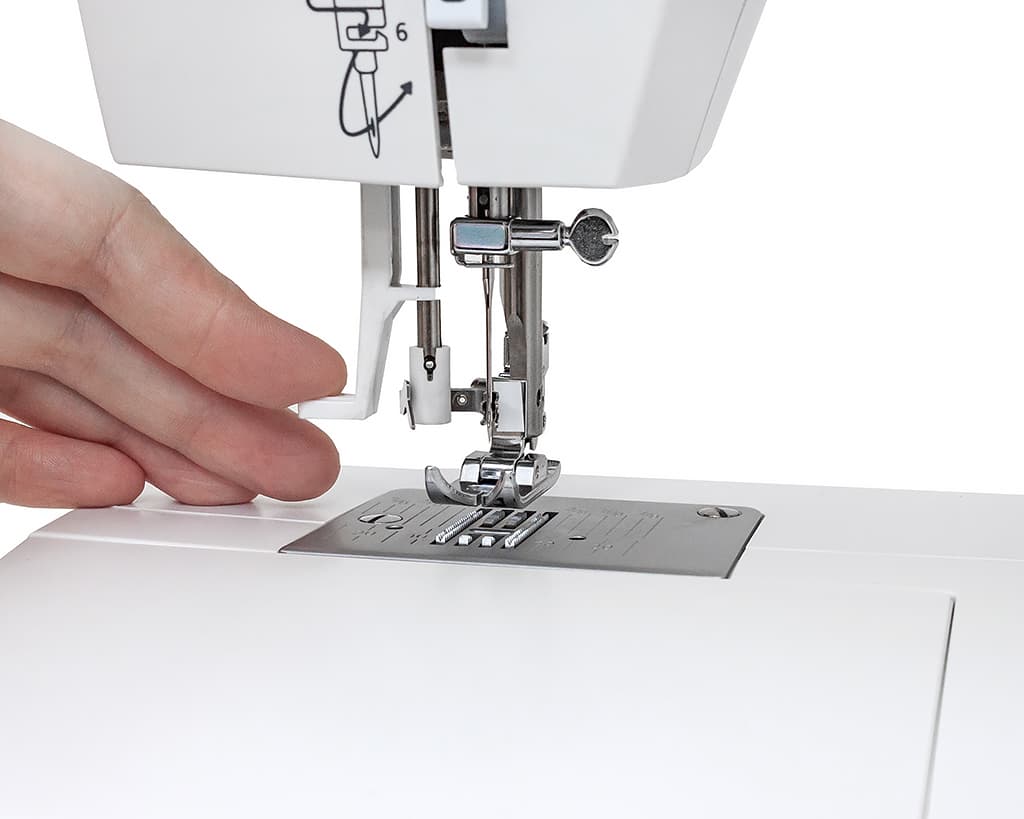 Встроенный заправщик нити облегчит вам трудоемкий процесс. Просто возьмитесь за кончик нити, а нитевдеватель сам протянет ее через ушко иглы.