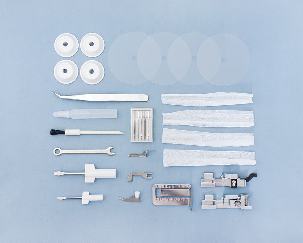 Оверлок Family ML545D обладает расширенным набором аксессуаров, в котором помимо основных принадлежностей вы найдете лапку для вшивания резинки, лапку для потайной подгибки низа и пластину-линейку для удобства направления края ткани.