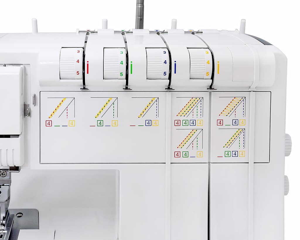 Машина Family ML 750 Pro позволяет получить 4 вида швов в зависимости от комбинации задействованных игл, метода заправки и натяжения нитей: цепная 2-х ниточная строчка, 2-х ниточный узкий и широкий распошивальный шов и 3-х ниточный прочный распошивальный шов. Схемы по заправке нитей относительно используемой строчки находятся на корпусе и на откидной крышке.