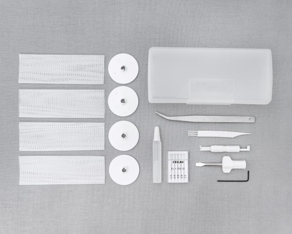 Машина Family ML 750 Pro позволяет устанавливать дополнительные аксессуары, например, для вшивания резинки или для изготовления шлевок, благодаря двум отверстиям в рабочей зоне справа от лапки.