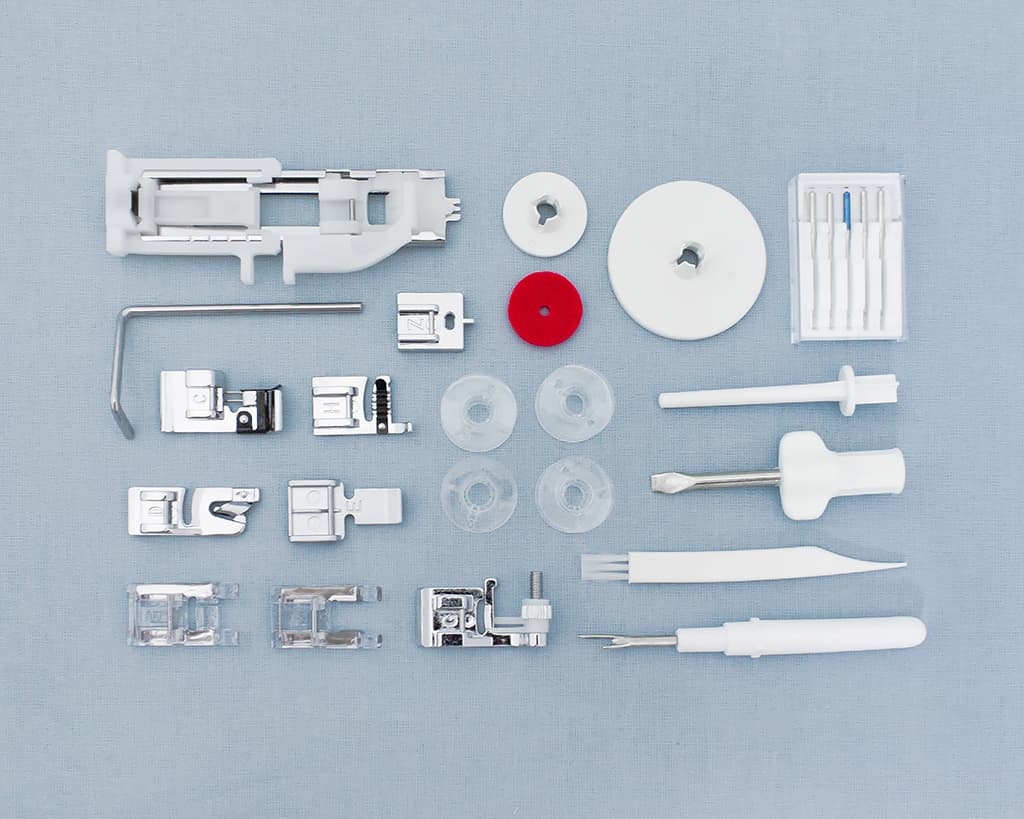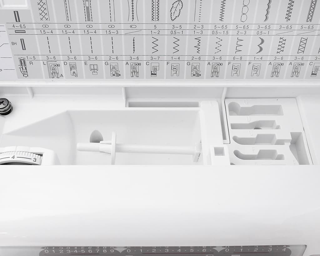 Под верхней крышкой вы найдете специальные ячейки, предназначенные для аккуратного хранения лапок и некоторых швейных принадлежностей. Все остальное вы можете хранить в отсеке для аксессуаров в съемной платформе.